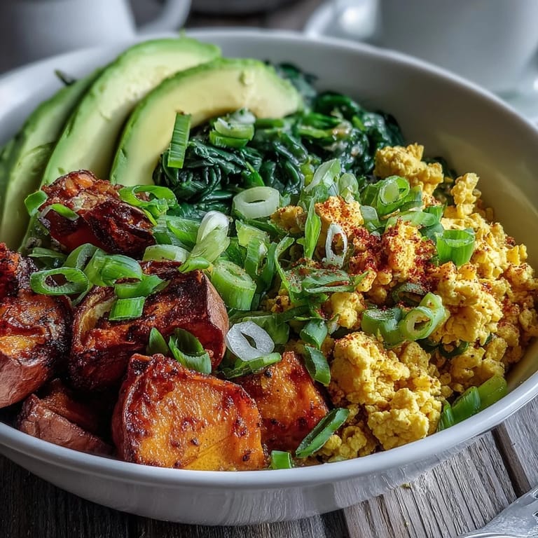 - Divide the cooked quinoa among four bowls. Top each with a portion of the tofu scramble, the roasted sweet potatoes, and avocado slices. Garnish with sliced green onions and fresh herbs if desired.